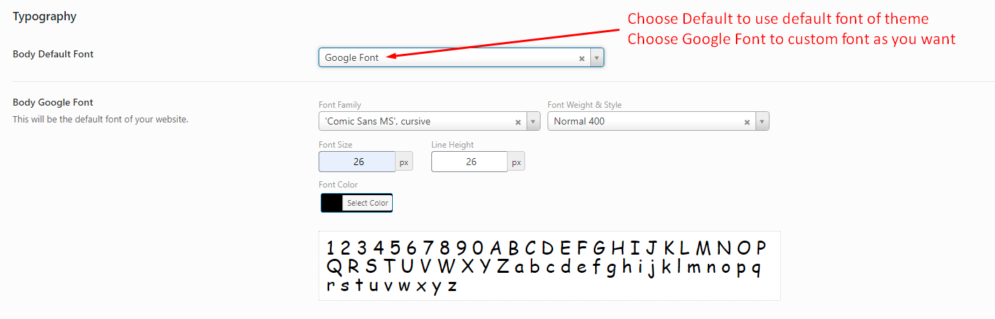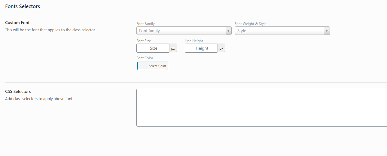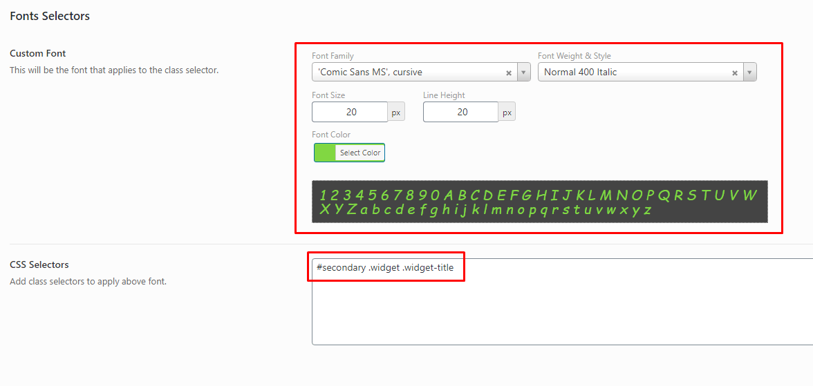 On this section, Frontline theme had some available fonts for you. If you want to set a special font for a special class, you only need to insert your class into Selector section, and choose the font that you want on the Font dropdown box. Finally, you click Save changes and see your result, all completed.