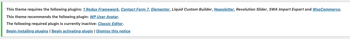 Once you have installed and activated our theme you will be prompted to install required and recommended plugins. Just click the link to Begin installing plugins.