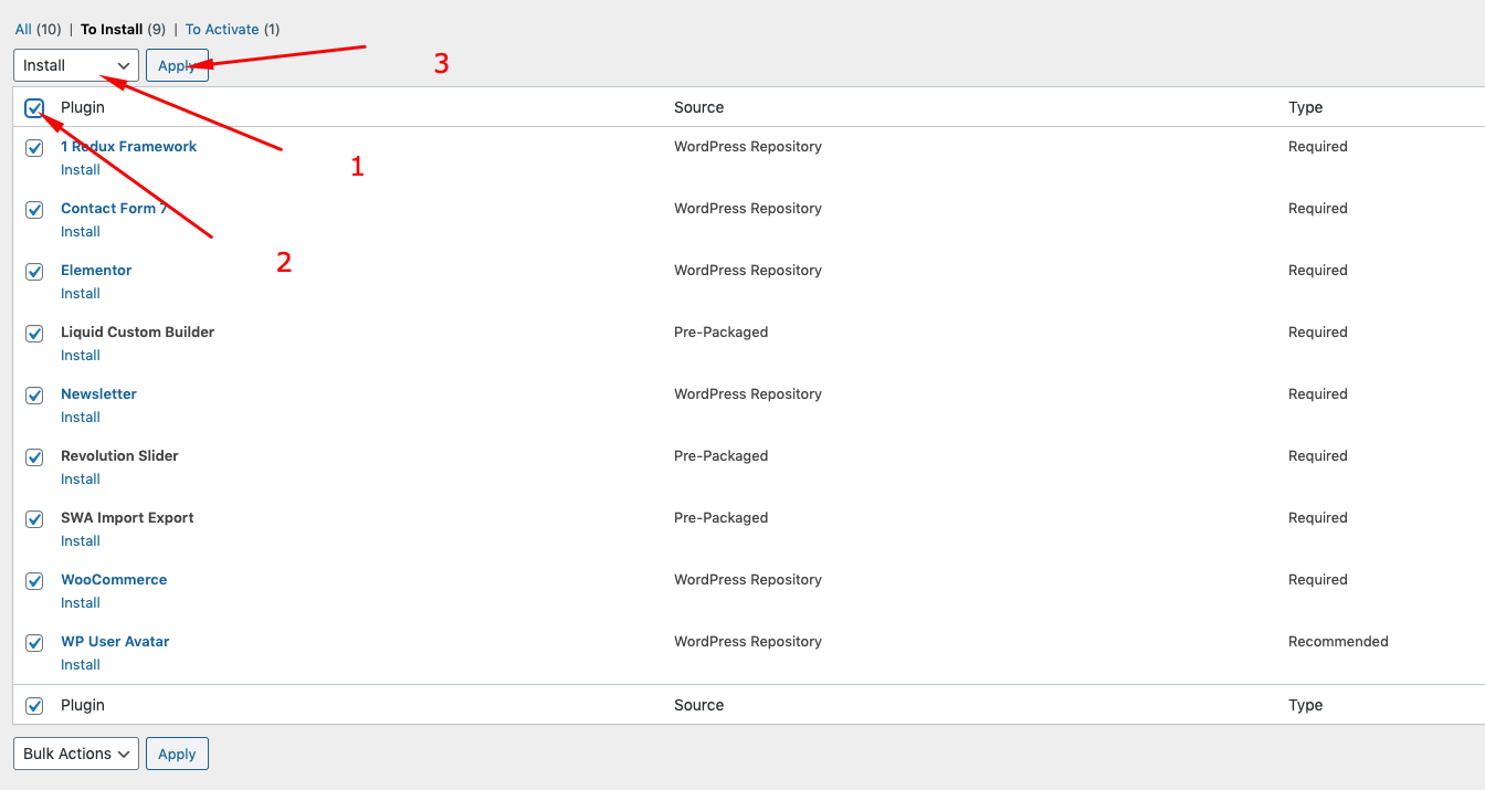 Next, check boxes to select all the plugins you want to install, select the bulk action of install from the dropdown box and then click the button to apply.