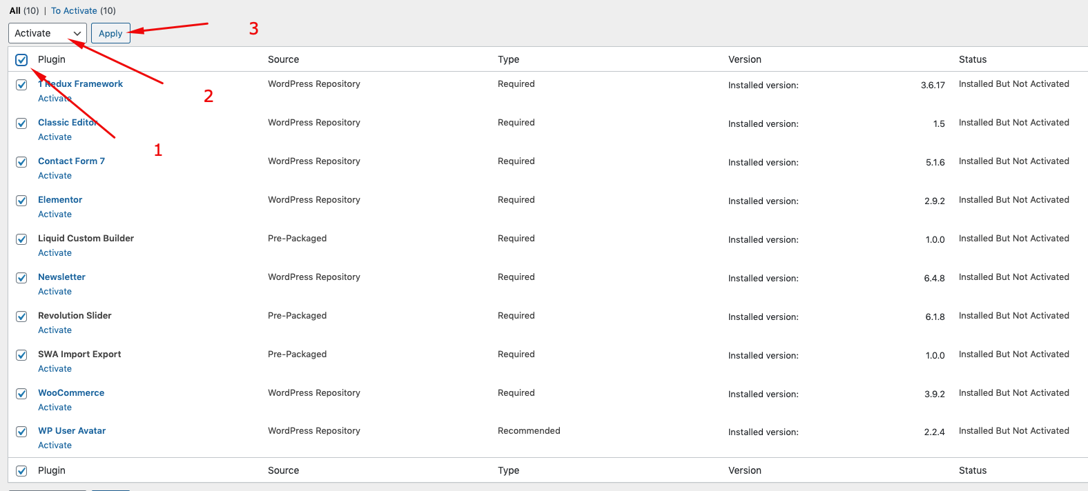 Select the plugins you had installed, and then apply the bulk action to activate them.
